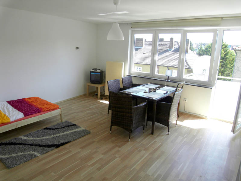 Zimmer 1 mit einem Bett, Tisch, TV und Balkonzugang