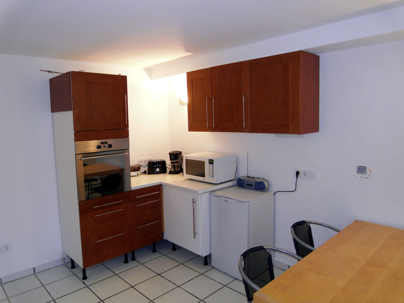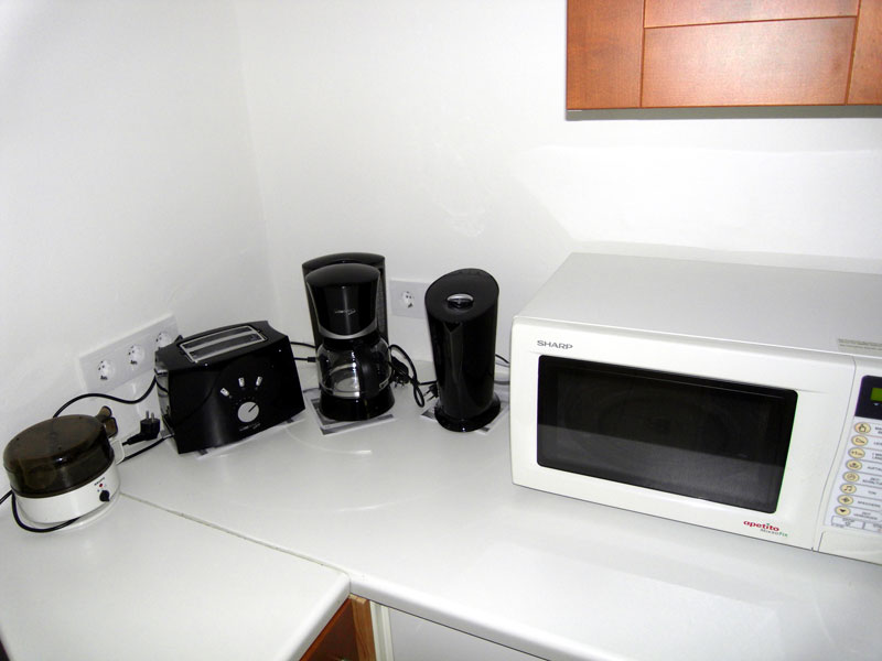 Backofen, Mikrowelle, Kühlschrank (mit Gefrierfach), Kaffeemaschine, Wasserkocher, Eierkocher